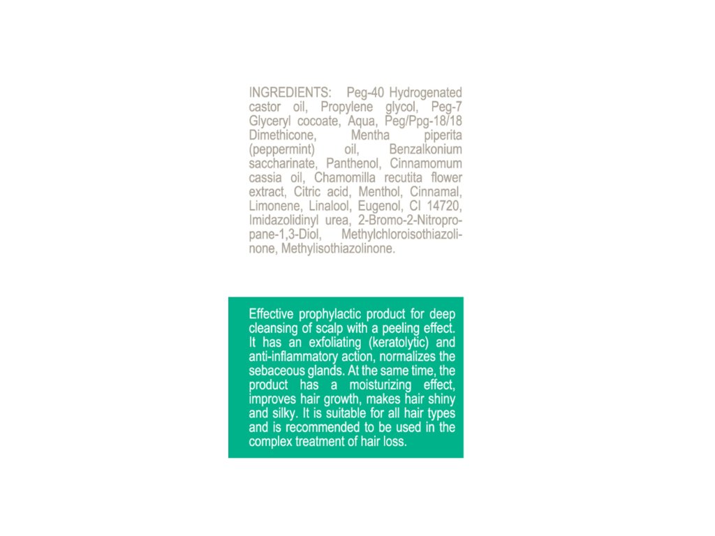 Peelingový gel pro hloubkové čištění pokožky hlavy exfoliuje rohovou vrstvu, normalizuje diferenciaci keratinocytů a reguluje funkci kožního mazu. Jemně čistí pokožku, má antiseptické a protizánětlivé účinky a je vhodný i pro tu nejcitlivější pleť.